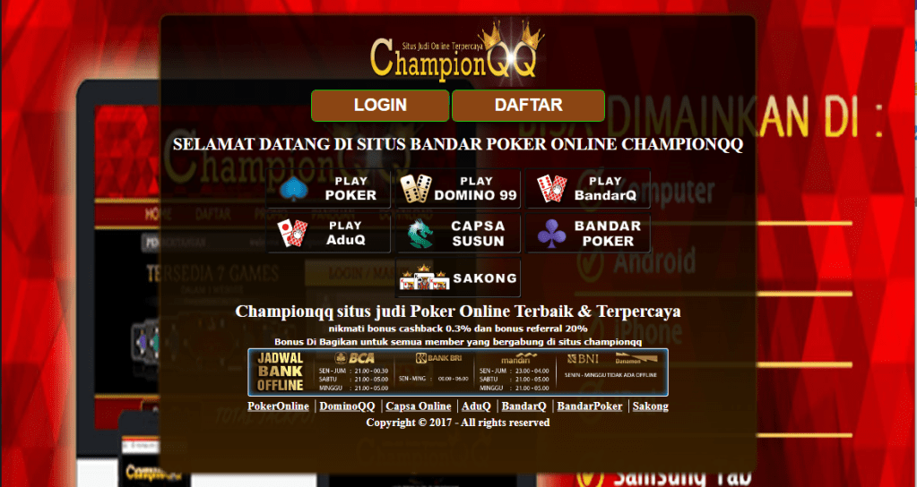 championqq adalah Situs poker online terbauj di indinesia , yang di akui sebagai situs judi online yang Bersih , Sportif , Aman dan terpecaya .Dan sangat cocok untuk mengobati luka para peminat judi online yang terlanjur kecewa dengan situs judi online abal abal .daftar Championqq